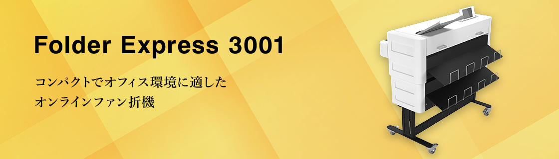 Folder Express 3001はオンラインでのファン折り対応の折機でオフィス環境にも適したコンパクトデザインを採用。ファン折りにしたものを手動給紙することによりクロス折り(A4仕上げ/210mm)にすることも可能です。最大幅914mmの折り畳みが可能でCADおよびGIS環境に最適です。