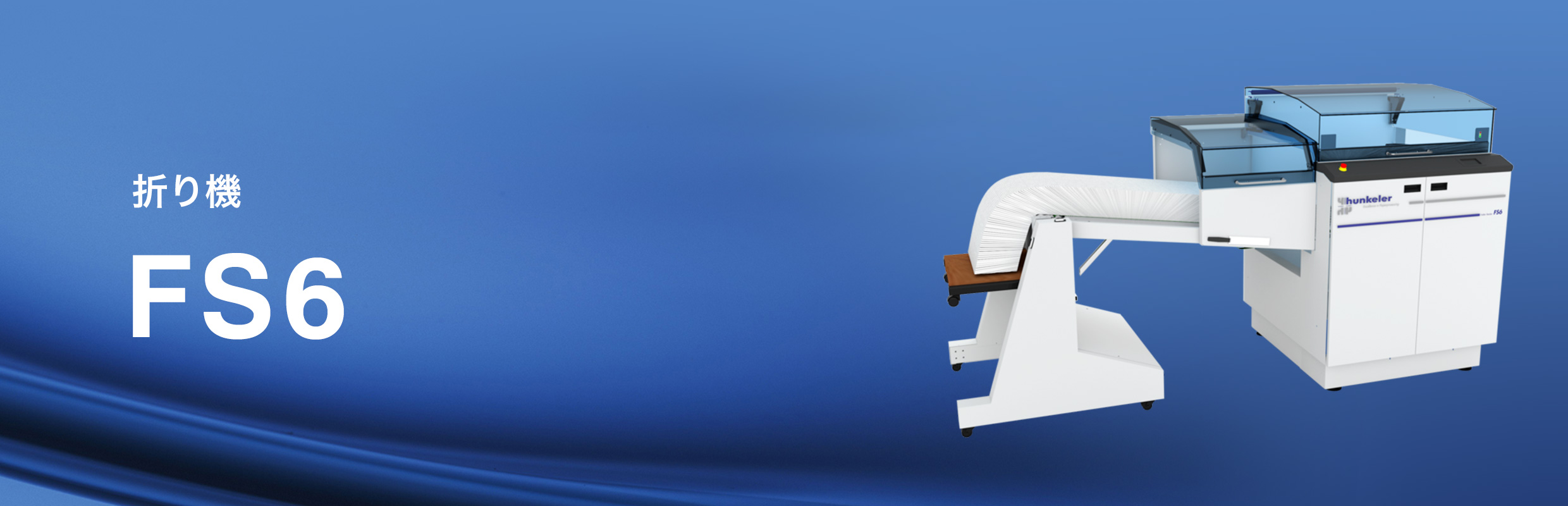 折り機FS6は、プリンターとオンラインで印刷済みの連続用紙をさしみ状に折り畳み、ベルトコンベアーに排出する装置です。コンパクトながら安定稼働の実現により生産性を大幅にアップさせることができます。