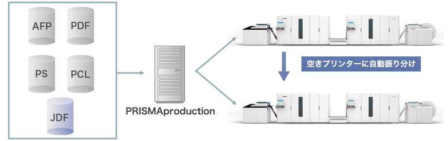 PRISMAproductionに同種のプリンターを複数台接続して、同種の空きプリンターに自動振り分けするクラスタ機能により、印刷システムの生産性を最大化することができます。