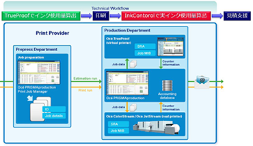 インク使用量管理機能により、PRISMAproductionに接続されたインクジェットプリンターで使用したインク量のレポーティングが可能で、正確なインクコストを把握、管理することが可能です。また、インク使用量の蓄積データを分析することにより、印刷業務全般のコスト分析も可能です。また関連ソフトのTrueProofは、プリンターコントローラのエミュレーション機能により、印刷前に、画面プルーフとインク使用量の概算予測が可能です。