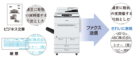 ファクス送信時に、原稿をカラーでスキャンします。これにより、帳票原稿などの薄青原稿の下地を正しく除去することができ、文字再現性を向上しています。また、下地が濃い原稿をスキャンする時には、白と黒の濃淡識別の条件を見直し、判別分析法を採用して最適処理することで、正しく文字再現できるようになっています。