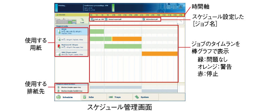 最大8時間先まで表示可能な「スケジューラー機能」用紙や消耗品の補充タイミングが把握でき、作業の効率化をサポート。