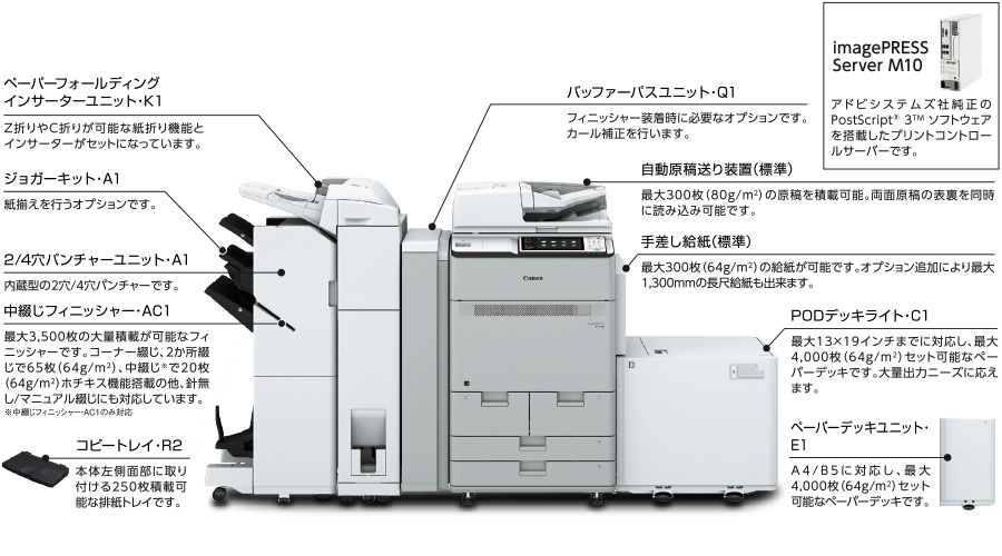 imagePRESS Server M10V2.0 | 3836C009 | 950,000円 | 7,500円 | アドビシステムズ社純正のPostScript 3ソフトウェアを搭載したプリントコントロールサーバー(本体背面に取付け)。PostScriptアプリケーションを使用するユーザーや、大量のプリントを必要とするオフィス環境に最適なオプションです。※2 | |