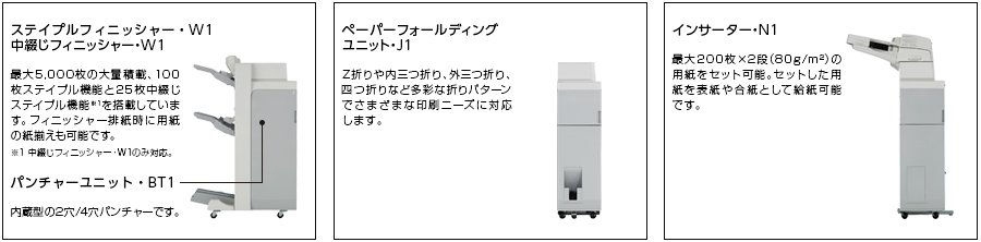 ペーパーフォールディングユニット・J1 | 0103C001 | 1,070,000円 | 3,000円 | Z折り、内3つ折り、外3つ折り、4つ折り、2つ折りが可能な紙折りオプション。装着にはバッファーパスユニット・Q1、ステイプルフィニッシャー・W1または中綴じフィニッシャー・W1が必要です。 |