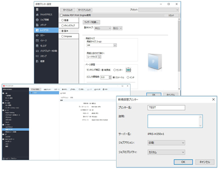 プロファイル情報や面付けなどの印刷設定を登録したバーチャルプリンターを作成することができます。「印刷キュー(Print)」、「直接接続(Direct)」、「待機キュー(Hold)」から選択でき、任意の名称設定も可能です。プリントのたびに設定を繰り返す手間が省けます。