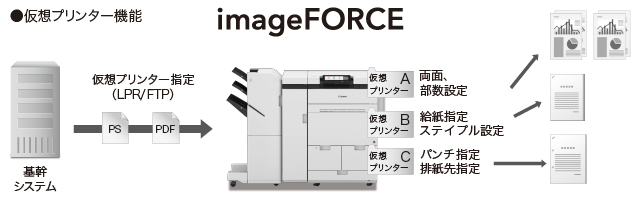 仮想プリンター機能では、1台のプリンターに対して複数の仮想プリンターに印刷設定(給紙段、両面など)をプリセットすることができます。業務システムからLPR/FTPコマンドでの出力時、仮想プリンターを指定するとプリセットされた印刷指定がジョブに反映されます。