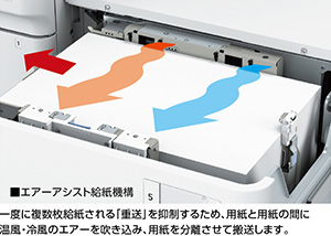 カセットで52~220g/m2、手差しで52~256g/m2の用紙坪量をカバー。薄紙から厚紙まで幅広く対応します。また、オプションのPODデッキには、サイドから用紙間へスイングエアーを吹きこむことで用紙の分離性を高め重送を抑制するエアーアシスト給紙機構を採用。安定した搬送で、紙詰まりを軽減します。
