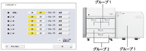 業務システムで指定したカセットの紙が無くなっても、プリンターでグループ化された別のカセットへ自動で給紙を切り換えます。複数種類の用紙を扱う業務でプリンターの給紙能力を最大限に発揮できます。