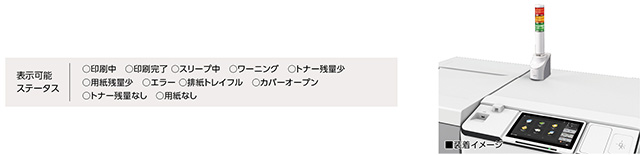 プリンターの状態を離れた場所から把握できるよう、状態表示キットⅡ「MPL-3a」をオプションで用意しています。高い位置に設置されたランプの点灯とアラート音で、出力完了、用紙切れなどマシンの状態を離れた場所からでも把握できます。