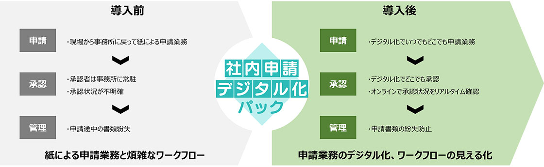 - 紙の書類による申請ではその後の承認状況の進捗がわからず、作業が止まってしまう