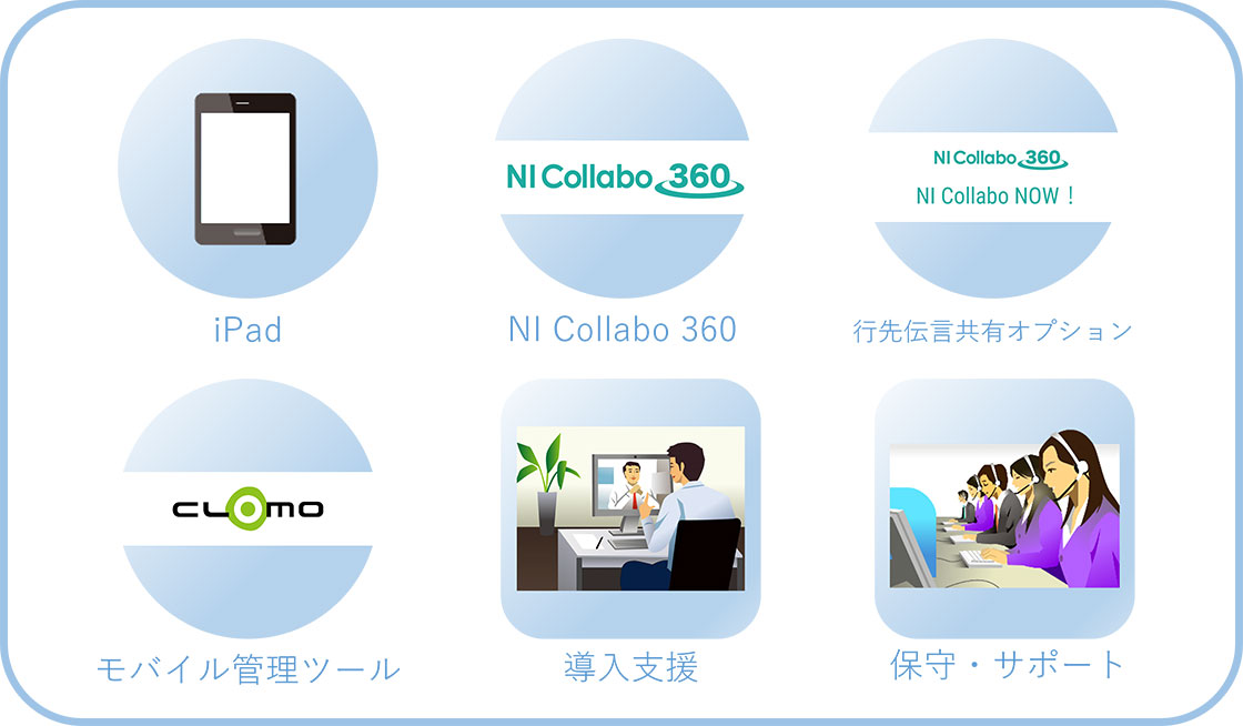 スケジュール・伝言板デジタル化パックは、NI Collabo 360を活用しスケジュール管理をインターネット上で行うことで予定のリアルタイム更新・共有ができ、従業員同士の連携強化が行えるソリューションです。従業員の予定管理だけでなく、会議室・備品の予約やGoogleカレンダーとの連携、閲覧制限など豊富な機能を取り揃えております。デバイスのセキュリティ対応や導入支援も手厚く、安心してご導入いただけます。