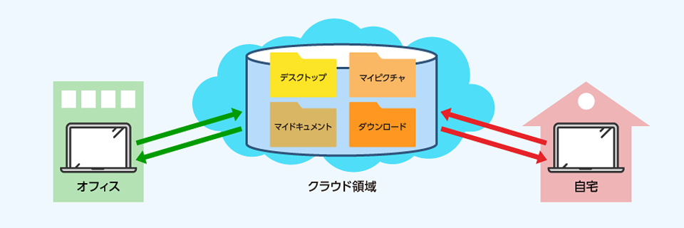 Windows端末上の「デスクトップ」「マイドキュメント」「マイピクチャ」「ダウンロード」の4フォルダのデータをクラウド環境に移動し、そこで安全に保管するソリューションです。クラウドへのデータ移動が終わった時、Windows端末上の各ファイルは、クラウド上にあるファイルへのショートカットになります。