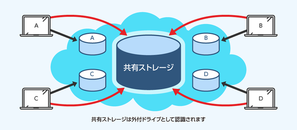 クラウド上の領域に、各ユーザーが利用可能な共有領域を用意する機能です。これによりNAS無しでファイル共有が行えるようになります。