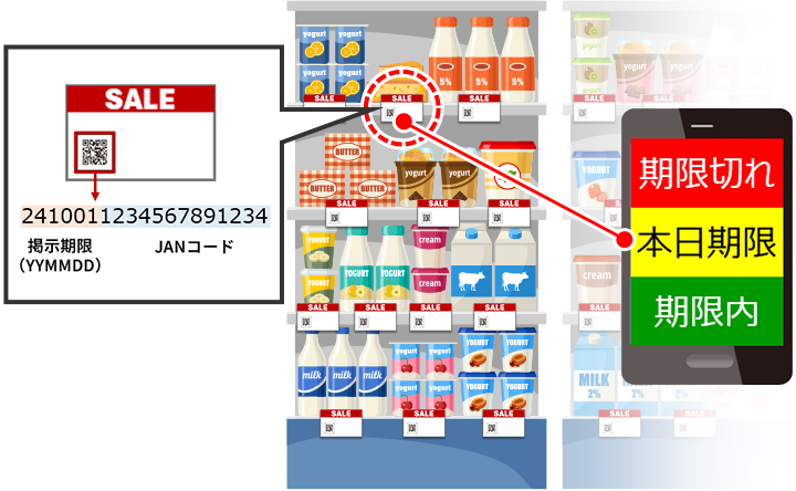 掲示期限、JANコードのデータを元に、ポップエースで取り外しチェック用のコードを生成、コード付きのPOPを作成します。
