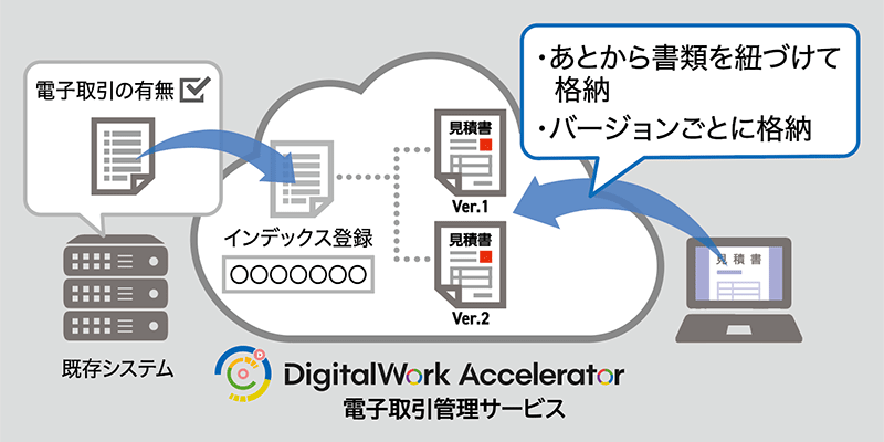 「現在の運用としては、既存システムで作成した伝票の中で一部電子取引対応できないものは、電子取引の有無をチェックする欄をシステム上で設けています。そのチェックをもとにDigitalWork Accelerator 電子取引管理サービスの方に『バッチ登録』としてデータ作成に必要なインデックス情報を先行登録して、あとから書類を紐づけて格納している形です」(倉地氏)。