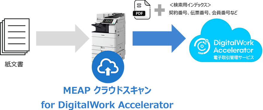 MEAP クラウドスキャン for DigitalWork Acceleratorは、キヤノン製複合機でスキャンしたデータをDigitalWork Accelerator 電子取引管理サービスへ直接アップロードするための機能拡張アプリケーションです。