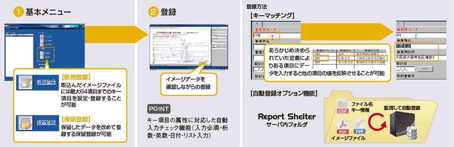 スキャン取込みしたデータに最大64項目までのキー項目を設定・登録ができ、イメージデータを確認しながらキー項目を逐次入力など、より効率的な登録が行える機能を備えています。