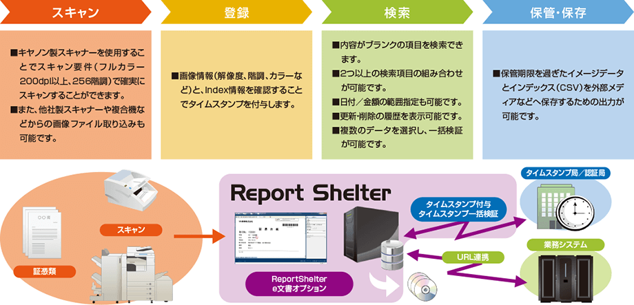 Report Shelter 「e文書オプション」は、国税関係書類のe-文書法(電子帳簿保存法スキャナ保存制度)に対応するためのシステム要件に合わせて追加した機能群です。国税関連書類をスキャンし、画面で確認・登録することによりタイムスタンプを付与し、定期的にタイムスタンプを検証して改ざんの確認が可能です。
