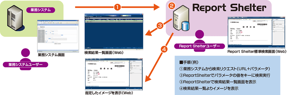 ERPやCRMなどの業務システムからパラメータ付のURLを発行し、Report Shelter内のイメージデータの検索が可能です。