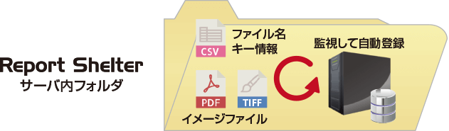 自動登録オプションは、ReportShelterサーバ内に設定した取込み用フォルダに存在するイメージファイルを自動的に登録できるオプション機能です。イメージファイル名とキー項目情報がセットされたCSVファイルと対象のイメージファイルが存在することが条件です。