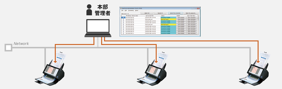 スキャナーを使った定型業務の変更があった場合の設定変更は、スキャナー端末ごとに設定変更を行う必要はありません。本部の管理者が設定を登録し、同一の設定を一斉配信することが可能です。