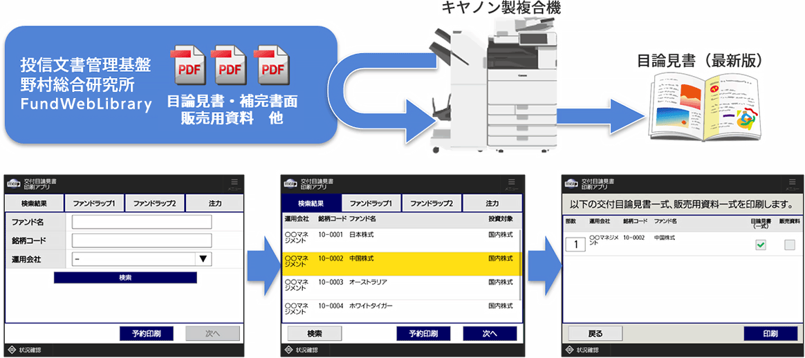 「目論見書オンデマンド印刷システム」は、目論見書や販売資料等をキヤノン複合機からオンデマンド印刷するシステムです。