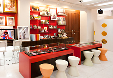 撮影した写真をその場で見ていただけるよう、「ムービーシアター」という空間を用意しているが、そのインテリアデザインは実に個性的だ。「プロに撮ってもらったことをお客さまに喜んでいただける空間にしたかった。だから、ちょっと夢のある異空間がいいと思ったんです。そこで宇宙船をイメージして設計してもらいました」。この特別な空間でのプレゼンテーションは、実際アルバムの拡販にもつながっているそうだ。また、同社はエントランスに「フォトバー」と名付け たスペースを設けている。「ロケーションやスタジオなど、いろいろな写真を簡単に手に取れる小さなパネルにして並べています。すると、バーカウンターじゃないですけど、“あ、この場所いいね。こんな感じで撮って”とお客さまから気軽に注文してくれるんですよ」。お客さまとのふれあいを大切にした工夫が随所に見られる。