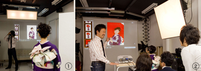 撮影の際は、お客さまの正面に同時進行で画像を投影(①)。