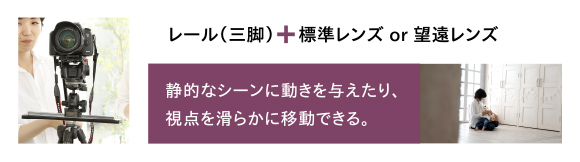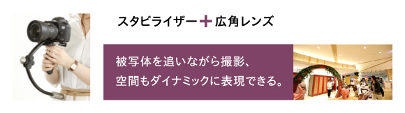機材の組み合わせはいろいろなパターンが考えられます。たとえば、1台のカメラはレールか一脚で。こちらは標準レンズか望遠レンズを使用。もう1台のカメラは広角レンズとスタビライザー。