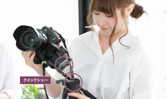小野寺:そうなんです。しかもレールの場合は高さの調整もちょっと面倒。ですから、動いているお子さんの表情を狙うときには、一脚に付け替えて撮ります。ただ通常は簡単に付け替えはできません。ここで便利なのが「クイックシュー」です。カメラと雲台にクイックシューを取り付けておけば、レールから一脚へ、一脚からレールへと“カチャッ”と簡単に付け替えられます。みなさんも助けられることがあると思いますので、ぜひ活用してください。