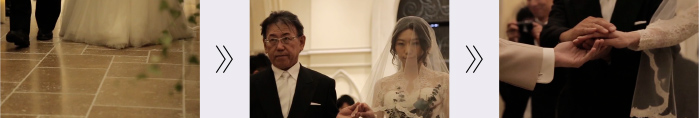 小野寺:ご新婦様が入場して、お父さんがご新郎様に引き渡す。その一連の流れを、前から、横からとカットを割ってつないでいます。