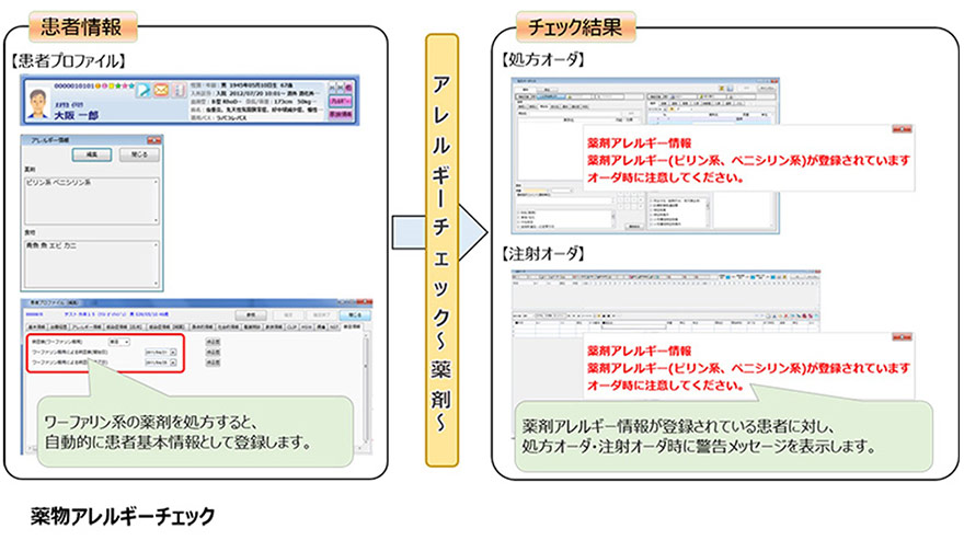 患者基本情報に薬剤アレルギー情報を登録すると、処方オーダ・注射オーダ時に警告メッセージを表示します。