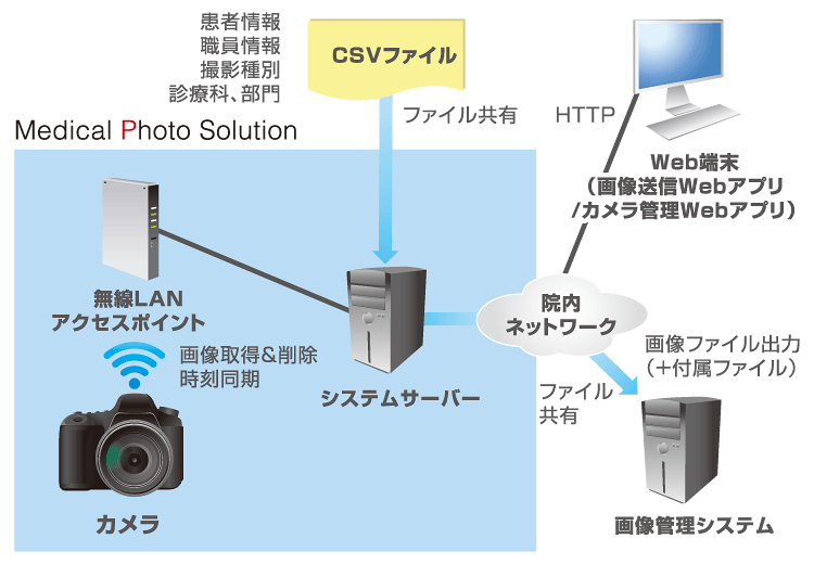 Medical Photo Solutionは、医療現場におけるデジタルカメラ画像の運用管理上の課題を解決するソリューションです。キヤノン製デジタルカメラで撮影した画像をサーバーに取り込み、患者属性等の撮影情報を付加して電子カルテやPACSなど指定された画像管理システムに出力、転送することができます。