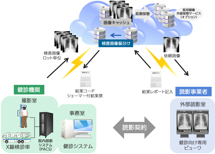“健診向け遠隔読影インフラサービス”は、健診機関から依頼されたX線撮影装置などで撮影した検査画像を専門の読影医師が読影し、結果レポートを健診システムと連携させることができるサービスです。