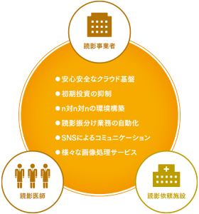 読影依頼施設がCTやMRIなどで撮影した検査画像を読影事業者が読影し、読影レポートを依頼施設に返す仕組みを提供する「遠隔読影インフラサービス」。