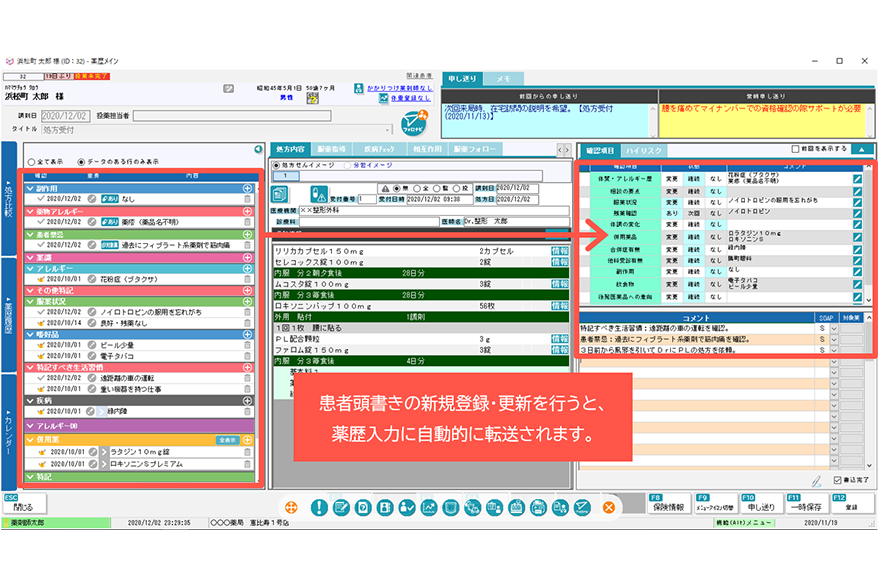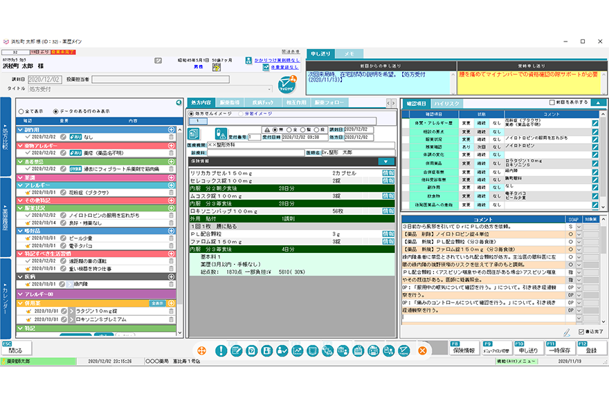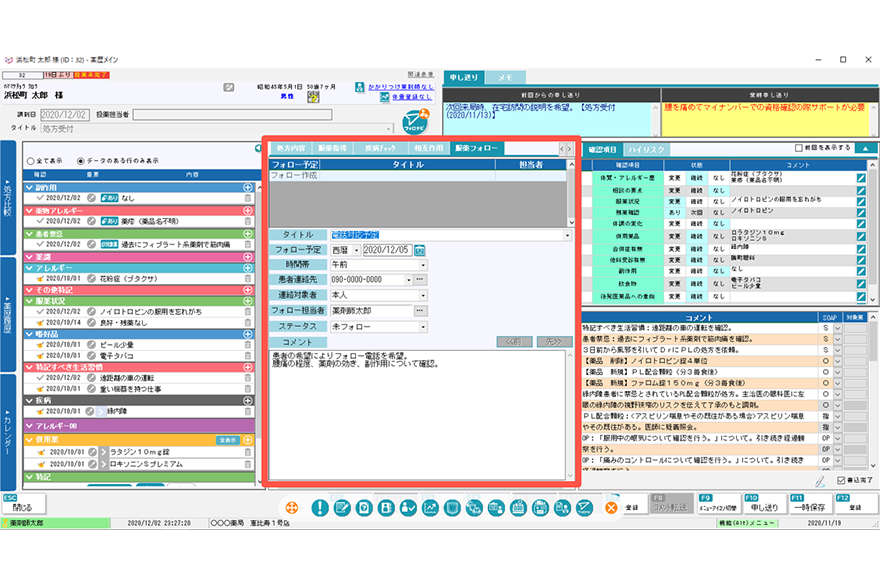 LINEでのやり取り通知は、電子薬歴で確認することができるため、患者さまからの重要なメッセージを見落とすことはありません。さらに、LINEでのやりとり結果は電子薬歴上で確認でき、コメントを薬歴に連携することができます。