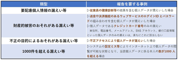 改正個人情報保護法において、個人情報保護委員会への報告が求められる情報漏えいのパターン。健康診断結果のような「要配慮個人情報」の場合は、たとえ1件であっても報告義務が生じる。