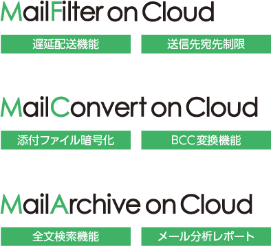 クラウド化したメールのセキュリティはそのままでは不十分。送信保留、添付ファイル暗号化など、情報漏えい対策に必要な機能を付加しセキュリティを強化。