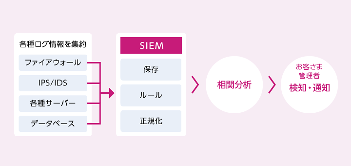 複数のシステムログを収集・分析するSIEMは、日常業務とは異なる不審な行動がある場合には即座に対応が可能です。外部脅威だけではなく、組織内部の不正が原因となる情報漏洩の対策にもつながります。