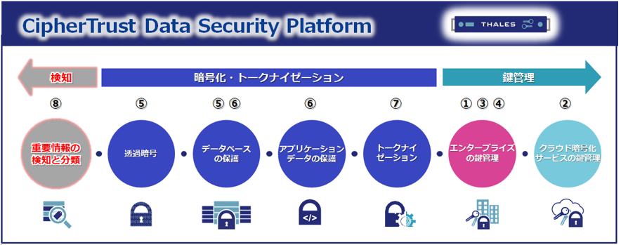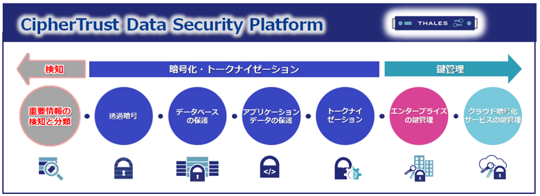 “CipherTrust Data Security Platform”は、データセキュリティ上重要な役割を担う製品群を統合したプラットフォームです。本プラットフォームにより、グローバルおよび各地域レベルで異なるプライバシー規制強化に対応できるだけでなく、リモートワークによって急速に増加するクラウドへのセキュリティ対策も可能にします。機密データへのアクセスを保護、制御する機能と、オンプレミスや複数のクラウド環境で暗号化されたデータの暗号鍵およびデータアクセスポリシーを一元管理することで、より強固なセキュリティを可能にします。