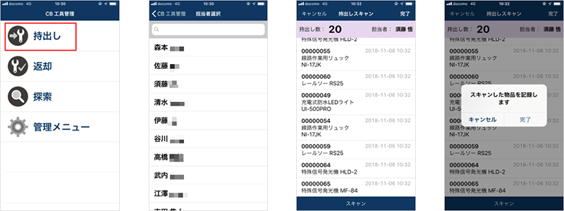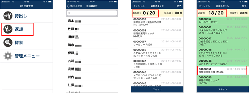 工具を返却する際にも、持出し時と同様の流れで処理を行います。
