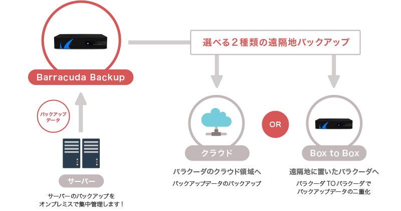 Barracuda Backupは、アプライアンスへのバックアップとクラウドを利用したオフサイトへのバックアップを実現できるソリューションです。災害に備えた遠隔バックアップも容易に実現が可能です。