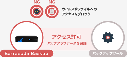 Barracuda Backupは、バックアップツールからのアクセスのみ許可し、その他の通信は通しません。そのため、ウイルスの脅威からもバックアップデータを保護できます。