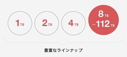 1TB、2TB、4TB、8TB~112TBの豊富なラインナップにより、利用用途によって機種選定可能です。