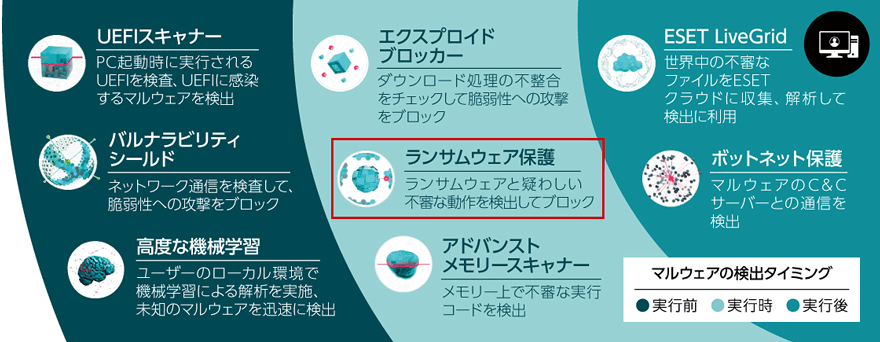 ESET PROTECT ソリューションの基本機能であるウイルス・スパイウェア対策機能による「多層防御」により防御をします。その「多層防御」の中には、ランサムウェアに特化した「ランサムウェア保護機能」があり、ランサムウェアと疑わしい不審な動作を検出した場合、ブロックが可能です。