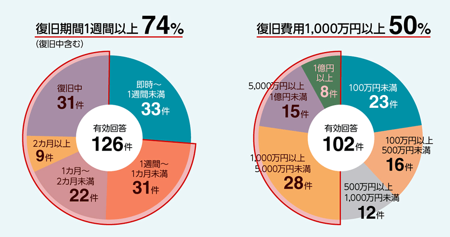 ランサムウェアに感染した際の復旧には、時間と費用が発生します。警察庁の発表では、復旧に1週間以上費やした法人が74%、復旧にかかった費用が1,000万円以上の法人が50%という結果でした。