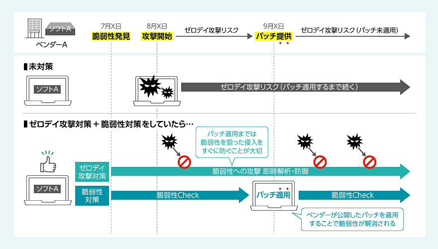脆弱性を修復するためにはパッチの適用が必要となりますが、ベンダーがパッチを提供するまでの間攻撃リスクが高まるため、その期間の防御が必要です。(ゼロデイ攻撃対策)