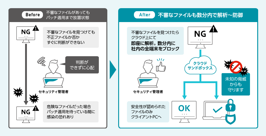ゼロデイ攻撃に用いられるような未知の高度なマルウェアも即時に検出、解析、防御。