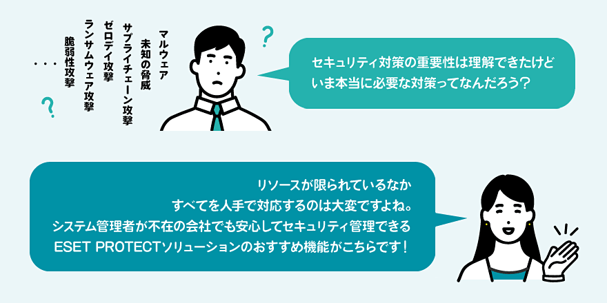 脆弱性や未知の脅威への対策強化が求められている今、より高度なセキュリティ対策としてESET PROTECT Advanced/ESET PROTECT Completeをおすすめします。