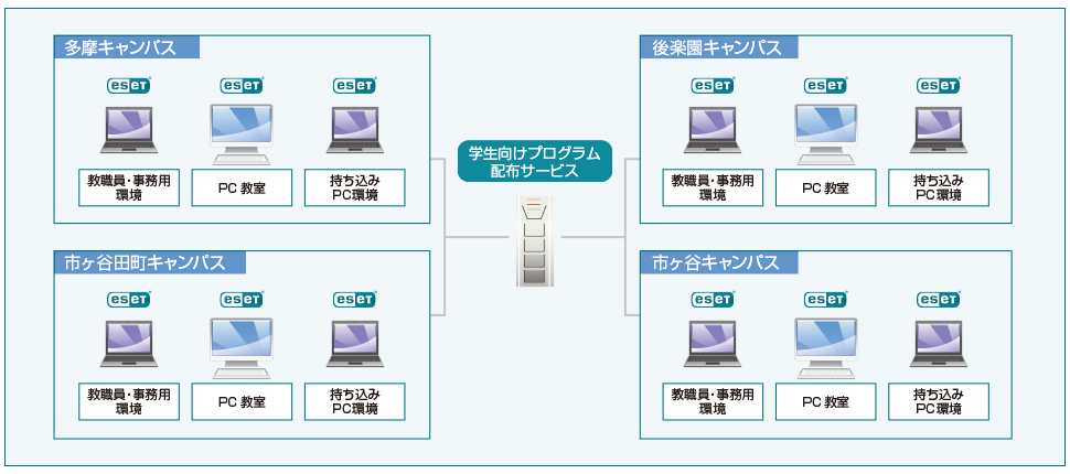 4キャンパスを擁する中央大学では、各キャンパスで利用されるPCや学生・教職員が持ち込むPCのセキュリティ対策にESET Endpoint Protection Advanced キャンパスライセンスを導入。対象PCの台数やOSの制限がなくなり、ライセンス管理負荷の軽減とコスト削減が実現できたと好評である。
